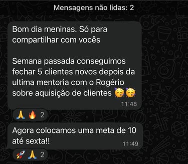 Você terá acesso contínuo por chamados e grupo no WhatsApp para tirar dúvidas, ajustar decisões e manter a execução andando, sem ficar travado ou esperar a próxima reunião.